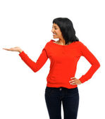 atrakcyjna kobieta przy jej biurku gospodarstwa puste karty biznesowe