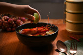 Zdjęcie "Zbożowe strzał z Tom mniam goong, tajskie tradycyjne jedzenie z krewetkami, gorąca pikantna zupa i tajskie składniki ziołowe w czarnej misce na ciemnym tle " może być wykorzystywane do celów osobistych i komercyjnych zgodnie z warunkami zakupionej licencji Royalty-free. Obraz jest dostępny do pobrania w jakości wysokiej rozdzielczości do 5760x3840.
