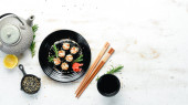Maki rolls - Filadelfia z serem i ogórkiem. Klasyczne japońskie sushi. Widok góry. Wolne miejsce na tekst