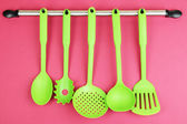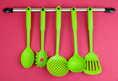 Plastikowe naczynia na srebrne haczyki na tle liliowy