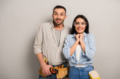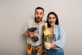 podekscytowani robotnicy trzymający puszkę farby, pędzle i wiertarkę elektryczną na szarości