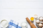 ciasto i produkty do jego przygotowania na ciemnym drewnianym tle
