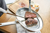 Kelner zarzyna się nożem. Różne grillowane mięso. Restauracja grillowa menu, seria zdjęć różnych mięs.
