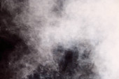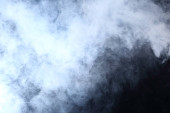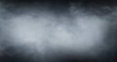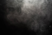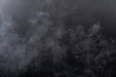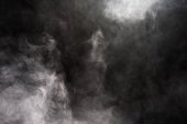 Gęste puszyste puszki białego dymu i mgły na czarnym tle, abstrakcyjne chmury dymu, nieostry ruch