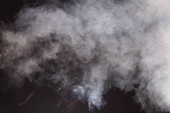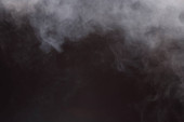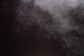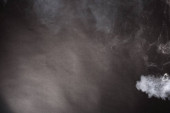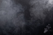 Gęste puszyste puszki białego dymu i mgły na czarnym tle, Abstrakcyjne chmury dymne, zamazane ruchy, nieostre intencje i wysoki kontrast niskiej ekspozycji, przestrzeń na kopiowanie logo tekstu