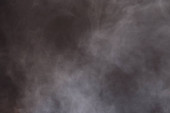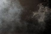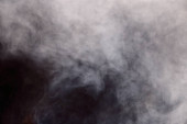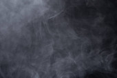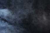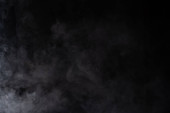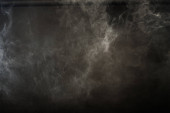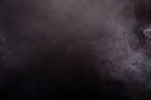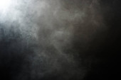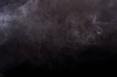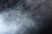 Gęste puszyste puszki białego dymu i mgły na czarnym tle, Abstrakcyjne chmury dymne, zamazane ruchy, nieostre intencje i wysoki kontrast niskiej ekspozycji, przestrzeń na kopiowanie logo tekstu