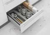 Otwórz szufladę kuchenną z naczyniami do gotowania. Magazynowanie i organizacja kuchni. 3d renderowanie.
