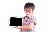 mały chłopiec azjatyckich w mundur studenta z komputera typu tablet jest