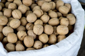 Tekstura orzechów włoskich na ladzie sklepu. Kontekst. Widok z góry pod kątem.