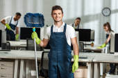przystojny sprzątaczka uśmiecha się trzymając mop w biurze