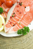 surowy łosoś, warzywa i przyprawy na starym drewnianym stole