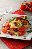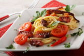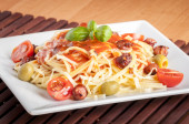 bucatini all'amatriciana, boczek, pomidory i ser
