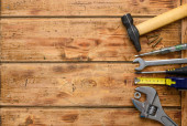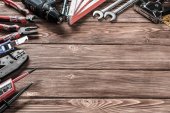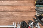 Zestaw narzędzi roboczych na drewnianym rustykalnym tle. Widok góry. Przestrzeń kopiowania