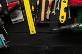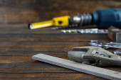 Zdjęcie "Zestaw narzędzi roboczych na drewnianym rustykalnym tle. Widok góry. Przestrzeń kopiowania" może być wykorzystywane do celów osobistych i komercyjnych zgodnie z warunkami zakupionej licencji Royalty-free. Obraz jest dostępny do pobrania w jakości wysokiej rozdzielczości do 5760x3840.