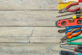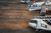 Zestaw narzędzi roboczych na drewnianym rustykalnym tle. Widok góry. Przestrzeń kopiowania