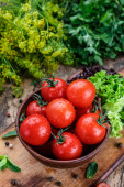 Jasne, soczyste, dojrzałe pomidory na gałęzi leżą wokół keczupu w misce sosu na drewnianym stole z ziołami, czosnkiem, gorącymi i ziele angielskie.