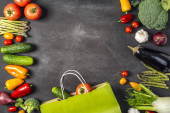 Martwa natura Torba papierowa z innym zdrowym jedzeniem na ciemnym tle