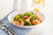 Zdjęcie "Grillowana sałatka krewetkowa ze świeżą sałatą, pomidorami wiśniowymi i sosem kremowym. Duża porcja na białym talerzu. Zamknij drzwi. Gotowy do jedzenia. Skupienie selektywne." może być wykorzystywane do celów osobistych i komercyjnych zgodnie z warunkami zakupionej licencji Royalty-free. Obraz jest dostępny do pobrania w jakości wysokiej rozdzielczości do 5760x3840.