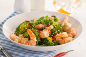 Grillowana sałatka krewetkowa ze świeżą sałatą, pomidorami wiśniowymi i sosem kremowym. Duża porcja na białym talerzu. Zamknij drzwi. Gotowy do jedzenia. Skupienie selektywne.