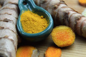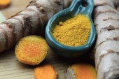 Świeża kurkuma na drewnianym stole Koncepcja tajlandzkiego zioła.