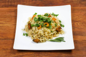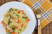 Kasza gryczana gotowana przygotowana z pieczarkami w plasterkach i cebulą posiekaną ozdobioną pietruszką na białym talerzu z widelcem na bambusowej macie stołowej, fragment, widok z góry