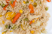 Zdjęcie "Kasza gryczana gotowana przygotowana z pieczarkami w plasterkach i cebulą posiekaną ozdobioną pietruszką na białym talerzu z widelcem na bambusowej macie stołowej, fragment, widok z góry" może być wykorzystywane do celów osobistych i komercyjnych zgodnie z warunkami zakupionej licencji Royalty-free. Obraz jest dostępny do pobrania w jakości wysokiej rozdzielczości do 5760x3840.