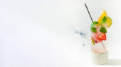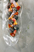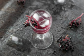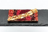 mrożone maliny czereśnie i jeżyny w kawałkach lodu w szklanej misce na czarnym tle