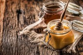 Słoik miodu z miodem i domowe wafle ozdobione truskawkami i orzechami włoskimi na drewnianym tle. Skupienie selektywne