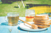 herbata z miodem i krojone białe ciasta plastry na drewnianym niebieskim tle stołu. Widok z góry
