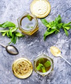 słoik miodu z kapiącą łyżeczką w talerzu i szklaną filiżanką herbaty. Na niebieskim drewnianym stole.