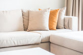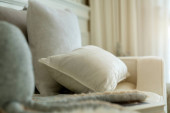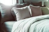 zbliżenie biały beżowy miękkie poduszki na łóżko i koc sypialnia wnętrze design concept.bed pokojówka luksusowe pomysły koncepcja