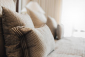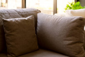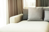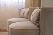 współczesne wnętrze salonu z częścią sofy w słoneczny dzień i biały zasłona wnętrza koncepcja tła
