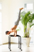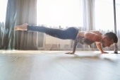 Muskularny sportowiec robi planszę gimnastyczną na niskich równoległych belkach podłogowych w jasnej, przestronnej siłowni z przestrzenią do kopiowania koncepcji zdrowia i fitness