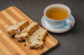Filiżanka herbaty i kawałek ciasta na drewnianym stole. Śniadanie. Widok z góry z copyspace dla Twojego texu