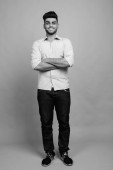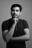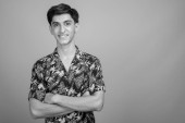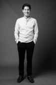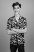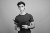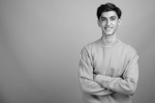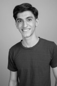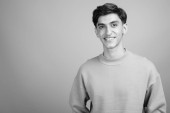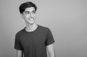 Studio strzał młody przystojny perski nastolatek chłopiec na szarym tle w czerni i bieli