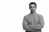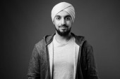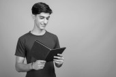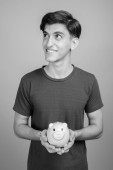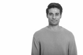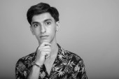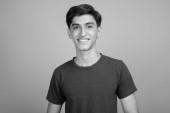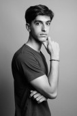 Studio strzał młody przystojny perski nastolatek chłopiec na szarym tle w czerni i bieli