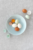 Gotowane jajko z żółtym żółtkiem w pobliżu białych jaj w niebieskiej misce na ciemnej, humorzastej czarnej równinie minimalne tło, widok kąta, szczęśliwy Wielkanoc