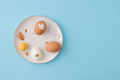 Gotowane jajko z żółtym żółtkiem w zielonej misce w pobliżu białych jaj na ciemnym humorzastym czarnym równinie minimalne tło, widok z góry, szczęśliwy Wielkanoc