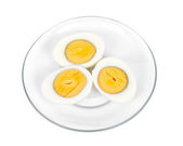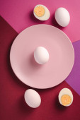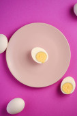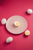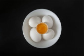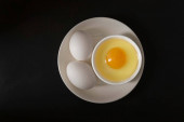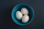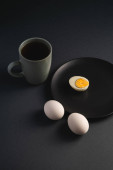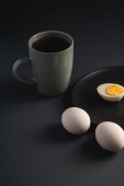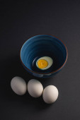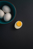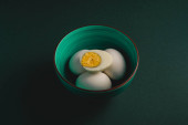 Gotowane jajko z żółtym żółtkiem z białymi jajkami w zielonej misce na ciemnym humorzastym czarnym równinie minimalne tło, widok z góry, szczęśliwy Wielkanoc