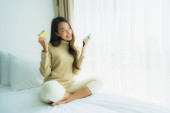 Młoda Azjatka z filiżanką kawy i czytać książki na łóżku we wnętrzu sypialni