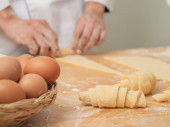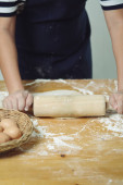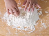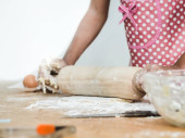 Dłonie dziecka przygotowujące ciasto na pizzę lub chleb, koncepcja stylu życia, ruch