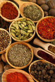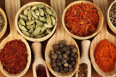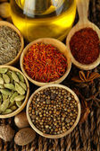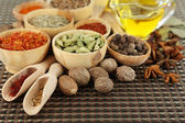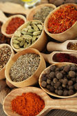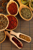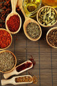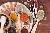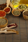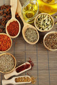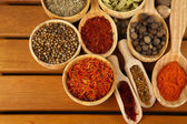 wiele różnych przypraw i pachnące zioła na drewniany stół szczegół