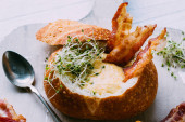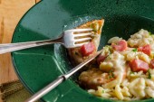 Śmietana i rozdrobniona wołowina na krojonym toście na marmurowym stole kuchennym znanym również jako S.O.S..