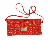 torebka z czerwonym kwadratowym wzorem skóry i metalowym paskiem, widok z tyłu pojedynczy obiekt na białym tle.