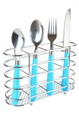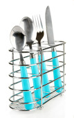 nóż, widelec i łyżki w metalowy stojak na białym tle