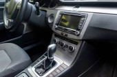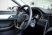 Wnętrze samochodu, widok na kierownicę i deskę rozdzielczą