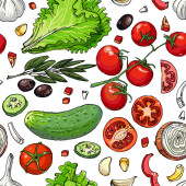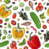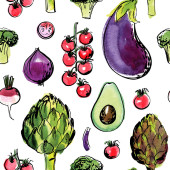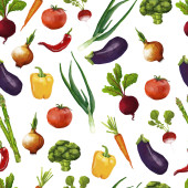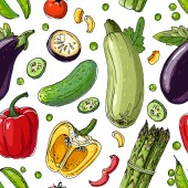 Wzorcowe warzywa. Bakłażan, pomidory, papryka, cebula, słodki groszek akwarela rysunek na białym tle. Rysunek farb żywnościowych.