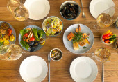 Zdjęcie "Widok góry serwowane zielone przekąski w misce i talerz sałatki z filiżanką kawy na stole" może być wykorzystywane do celów osobistych i komercyjnych zgodnie z warunkami zakupionej licencji Royalty-free. Obraz jest dostępny do pobrania w jakości wysokiej rozdzielczości do 5760x3840.