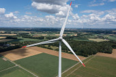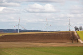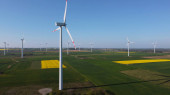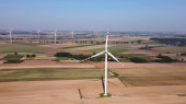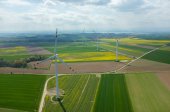Turbiny wiatrowe lub wiatraki na obszarach wiejskich w Niemczech. Energia odnawialna fotografowana dronem.