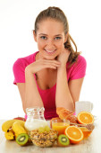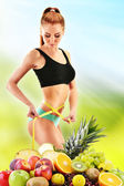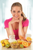 młoda kobieta trzyma miska szklana z sałatką owocową